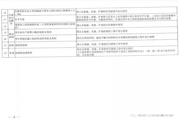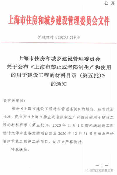 2020年9月30日,上海市住房和城市建設(shè)管理委員會關(guān)于公布《上海市禁止或者限制生產(chǎn)和使用的用于建設(shè)工程的材料目錄《(第五批)》的通知
